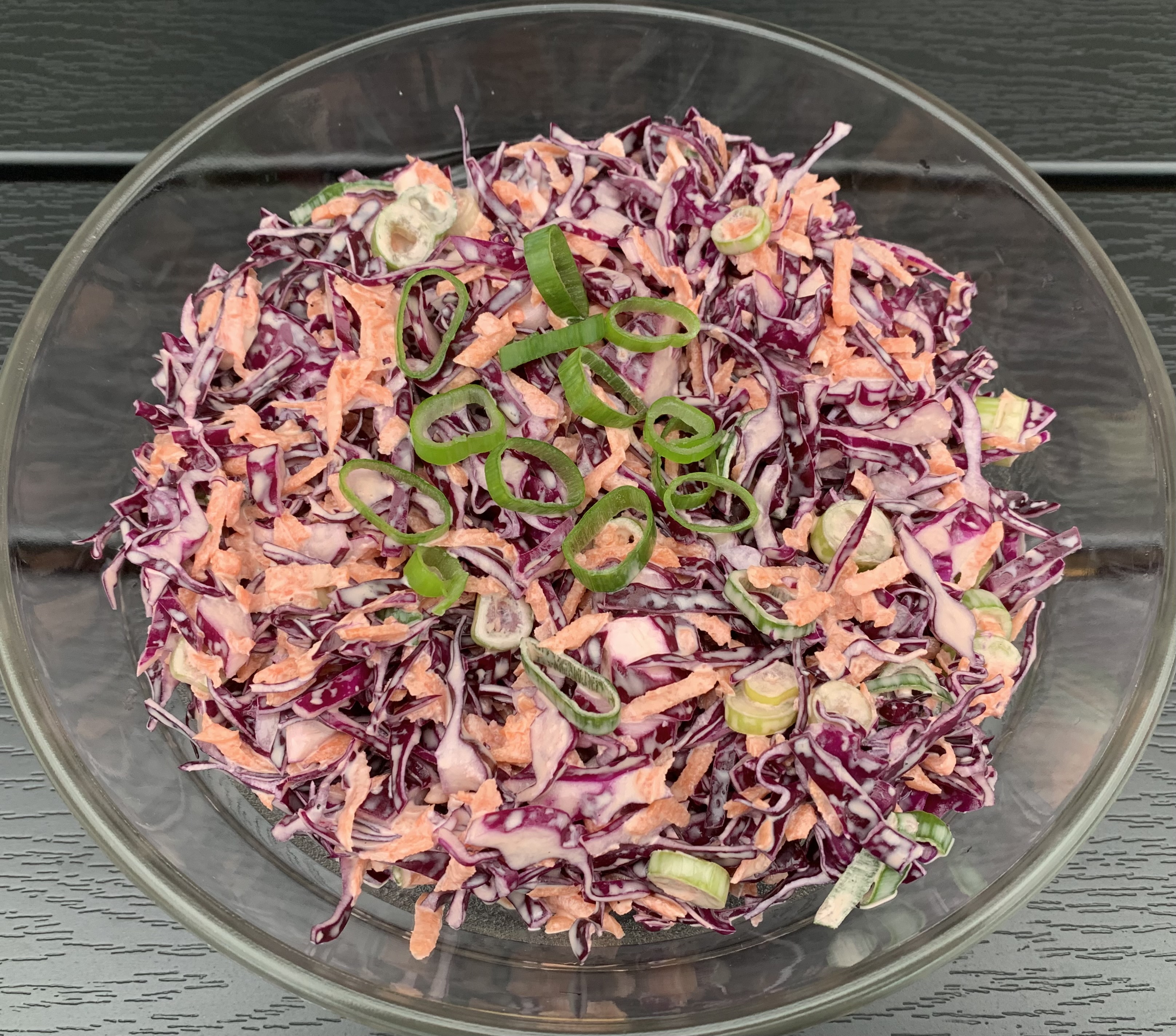 Bland gulerødder, rødkål og forårsløg sammen i en skål.